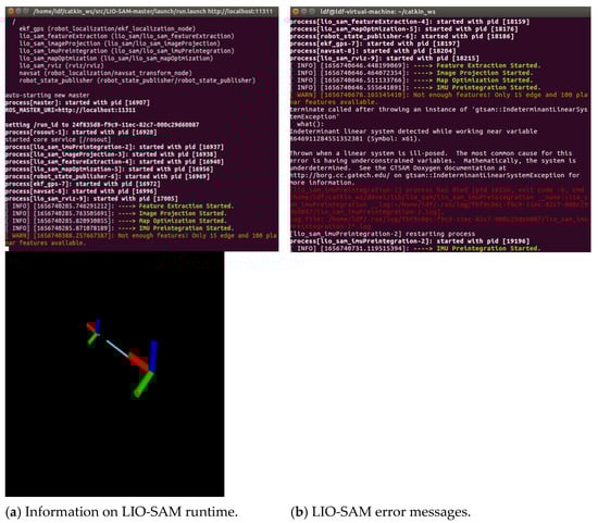 The method of this study is based on the improvement of LIO-SAM, therefore the feasibility of LIO was first tested in a common pipeline setting. After the change of the profile and after performing the corresponding calibration, the test was performed (Figure 16). The LIO-SAM system emitted a warning after entering the pipeline that there are not enough feature points (Figure 16a); therefore, a system error occurs after a certain operating period. From the point of view of the error message prompt, the cause is an error due to insufficient variable constraints, while mathematically, the system is in an indeterminate state (Figure 16b). As shown from the test results, the laser matching in LIO-SAM fails in the context of laser degradation scenarios, such as long corridors or pipelines. Since there are no significant geometric features in the pipeline, the results of the LiDAR scan are consistent everywhere, resulting in the robot not being able to determine its location and thereby causing the SLAM task to fail.