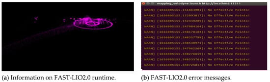 Subsequently, the feasibility of FAST-LIO2.0 was verified in this setting. FAST-LIO 2.0 [] is more complete, compared with FAST-LIO [], and an incremental kd-Tree (ikd-Tree) value was proposed on top of it, thus enabling kd-Tree to incrementally remove or add point clouds. By taking advantage of ikd-Tree, FAST-LIO2.0 no longer extracts edge and plan features similar to LOAM, but instead, directly aligns the respective 3D points with the map, such that it can operate more stably in some scenarios where manual feature extraction is more challenging. Figure 17 presents the results of the tests. FAST-LIO2.0 is capable of reconstructing part of the map (Figure 17a); however, the reduction was poor, and the point cloud map started to distort with the extension of the running time. The invalid point alert shown in Figure 17b continued to appear during the run until the system was stopped. This figure shows that FAST-LIO2.0 can achieve a stable performance in some environments where manual feature extraction is more challenging, whereas it fails in environments with high similarity and almost no geometrical features (e.g., pipes), especially in long, straight pipes; the SLAM task failure problem is due to the occurrence of insufficient feature points.