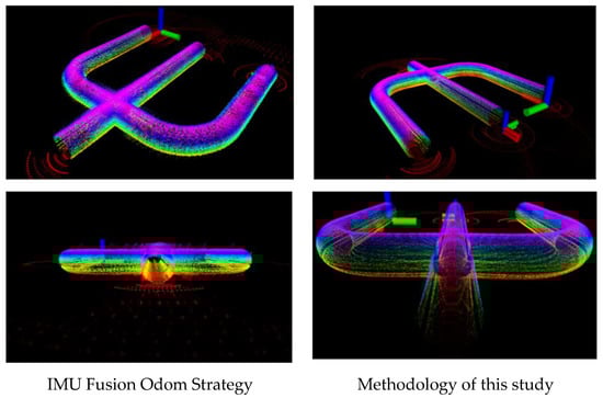 The results in Figure 19 suggest that in the single robot SLAM results, using the IMU Fusion Odom strategy for the real city simulation pipeline, the 3D map has considerable noise and multiple map ghosts, thus causing severe distortion of the local results. There was no significant noise and map ghosting in the SLAM results of this study, and the overall results were better than those of IMU fusion Odom, being higher than the IMU fusion Odom strategy in terms of robustness and reliability. As the pipeline size increases and the running time is extended, the method in this study still maintains a good SLAM effect, with the advantages of cumulative controllable error and high confidence and robustness. In the 3D pipeline map, the color does not represent the difference in the results, but simply a different coordinate system, selected in rviz.