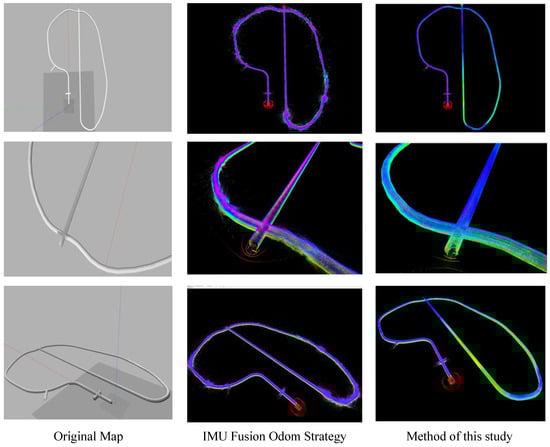 During the feasibility test in the previous section, both the method in this study and the single robot using the IMU fusion Odom strategy can accomplish the SLAM task in the simple pipeline, whereas there is a certain gap between the two methods in terms of accuracy, as well as of error. Thus, SLAM tests were performed in this section for the above two methods in simulated real city pipelines, and the two methods were compared. The test comparisons are presented in Figure 19.