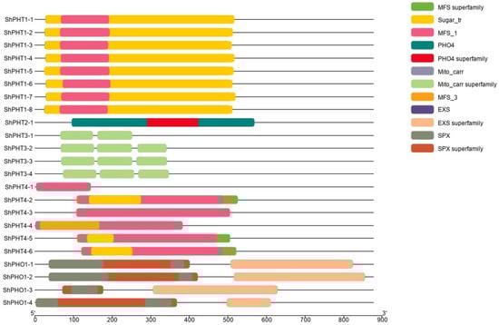 Conserved domains in ShPHT proteins were identified using the NCBI-CD database. The domains are represented by different colors. Schematic representation of the conserved domains integrated employing TBtools.