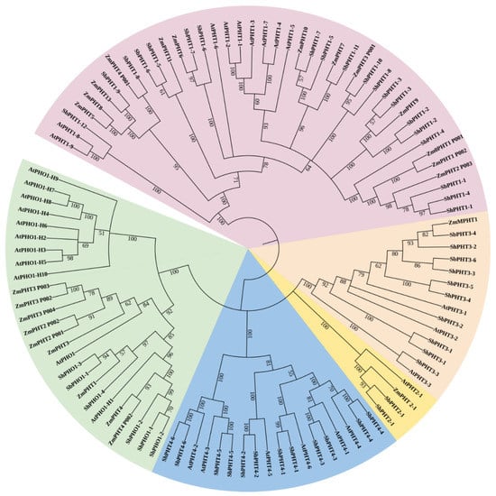 PHT genes are categorized into six groups, namely, PHT1, PHT2, PHT3, PHT4, PHT5, and PHO1, based on evolutionary relationships, protein sequences, structures, and functions [,]. In recent years, with increased efforts around whole-genome sequencing, all the members of the PHT gene family have been reported in a variety of species []. Members of the Pi transporter family are mostly expressed in roots, and others in shoots, leaves, and flowers []. PHT1, the high-affinity Pi transporters, mainly expressed in the plasma membrane of root cells, play a vital role in both Pi uptake from the soil and translocation []. The Pi transporter subfamilies, namely, PHT2/PHT4, PHT3, and PHT4, localize between the cytoplasm and plastids, mitochondria, and Golgi membranes for energy metabolism, respectively. The PHT5 family plays a crucial role in vacuolar mediating Pi storage and adaptation []. PHO1 has been reported in both Pi transport from root to shoot and Pi-deficiency response signal transduction cascade [].
