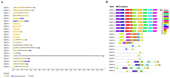 The intron/exon organization was established by aligning the genomic sequences with the CDS sequences. Gene Structure Display Server 2.0 (GSDS 2.0, http://gsds.cbi.pku.edu.cn/, (accessed on 20 May 2022)) [] was used to generate a schematic diagram of the exon–intron organization of ShPHT genes. To verify the presence of conserved motifs, the protein sequences were submitted to the NCBI conserved domain database (http://www.ncbi.nlm.nih.gov/Structure/cdd/wrpsb.cgi, (accessed on 17 May 2022)) [], SMART (http://smart.embl-heidelberg.de/, (accessed on 25 May 2022)) [], and Pfam server (http://pfam.xfam.org/, (accessed on 25 May 2022)) [], and the results were visualized using TBtools (https://github.com/CJ-Chen/TBtools, (accessed on 28 May 2022)) []. To understand the occurrence of motif diversity and conservation, the protein sequences of ShPHTs were analyzed using MEME Suite version 5.3.3 (https://meme-suite.org/meme/, (accessed on 23 May 2022)) using the default parameters and with the maximum number set to 20 []. The MEME results were then visualized using TBtools software.