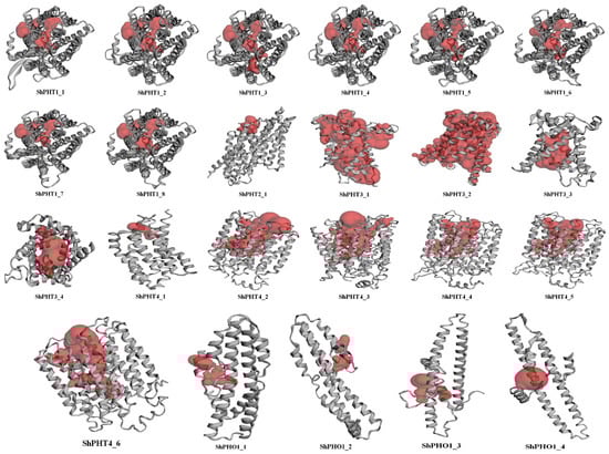 The predicted 3D structures and pocket binding sites of the ShPHT proteins. The putative 3D structures of ShPHT proteins were generated by the Phyre2 server, and the active catalytic binding sites were illustrated as red regions using the CASTp server 3.0.