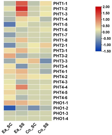 Heat map of PHT genes responding to salinity stress in sugarcane root based on the analysis of qRT_PCR expression of wild genotype E. arundinaceus IND99-907 (salinity tolerant) and Saccharum hybrid Co97010 (salinity sensitive) cultivars. Ea_SS represents the E. arundinaceus salinity stress, Ea_SS represents the E. arundinaceus salinity control, Sh_SS represents the Saccharum hybrid salinity-sensitive stress variety, and Sh_SC represents the Saccharum hybrid salinity-sensitive control variety. Red indicates high expression and green indicates low expression.
