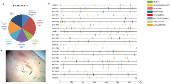Analysis of the ShPHT promoter regions. (A) Distribution of cis-regulatory elements into promoter regions of ShPHT genes (2 kb upstream from the CDS region). Classification of identified regulatory elements based on function, such as cell, developmental, light, tissue/organ, stress, hormone, binding domain, and others. (B). Distribution of different types of stress-related cis-regulatory elements. (C). Transient expression analysis of EaPHT1; 2 promoter. Red arrows indicate the GUS Expression identified on sugarcane leaf pieces.