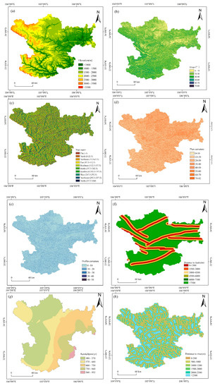 Different distribution densities and development degrees of rivers lead to different erosion abilities of slopes and surfaces [41]. The study area has developed water system and dense river network. Distance to rivers was divided into eight classes (Figure 5h).