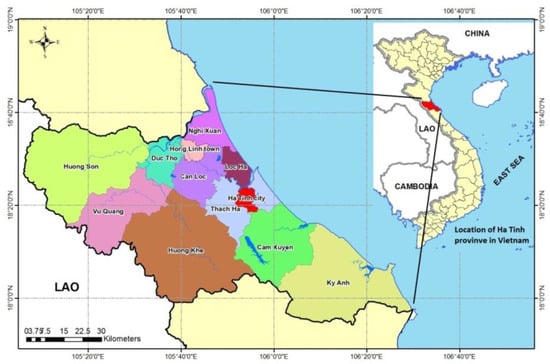 Ha Tinh is one of six provinces situated in the North Central coastal provinces with a total area of 6026 sq. km. It is located between 17°54′–18°38′ N latitude, 105°11′–106°36′ E longitude. Ha Tinh is bordered by Nghe An to the North, Quang Binh to the South, Lao People’s Democratic Republic to the West, and the East Sea to the East, with more than 137 km of the seashore. It is subdivided into 13 district-level subdivisions (Figure 1).