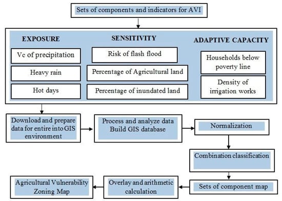A common method used to quantify the vulnerability to climate change is the index method [,,]. In this method, the selection of appropriate indicators used to assess vulnerability to climate change is very important, it closely depends on the research objective and study area []. In this case, agriculture is considered to be the objective of the study. Normally, agriculture or the growth of plants and animals is often influenced simultaneously by two groups, namely natural factors and socio-economic factors. From that, natural factors (e.g., temperature, rainfall, extreme weather, etc) and socio-economic factors (e.g., labor level, agricultural income from crop production, irrigation, etc) will be considered as input indicators [,]. It can be said that the index method brings a comprehensive approach and is considered suitable for assessing vulnerability as vulnerability is a theoretical phenomenon that cannot be measured as an observed phenomenon [,,]. According to IPCC, AV is the function of three components of vulnerability to climate change including exposure, susceptibility, and adaptive capacity. IPCC has taken the definition of these components. Accordingly, exposure (E) refers to the extent and the characteristics of a system exposed to significant climate variability. Sensitivity (S) means the degree of influence as a system stimulated by climate-related factors. Adaptive capacity (AC) is understood as the ability to make a profit and avoid loss as the natural and man-made systems are affected by the negative impact of climate change. The relevant natural or socio-economic indicators are classified into the above three groups of components. Although this method proved to be very effective and applied to many parts of the world, there have not been enough thoroughly researched projects on AV conducted in Vietnam so far. In this context, the objectives of this study are: (1) Determine and assess the impact of indicators on agricultural vulnerability; (2) Classification of agricultural vulnerability in the study area to climate change. As such, three components were captured via eight indicators: (1) Variation coefficient of precipitation; (2) Heavy rain; (3) Hot days; (4) Risk of flash flood; (5) Percentage of agricultural land; (6) Percentage of inundated area; (7) Household below poverty line; and (8) The density of irrigation works. Values of indicators were normalized and a relationship matrix among indicators was built in the GIS environment. As a result, the level of AV in the study area is classified into five levels: very low, low, moderate, high, and very high based on the range of AV. The results obtained from this study provide useful information for planning and determining guidelines to help farmers in the area.
