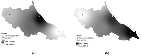 As described in the research methods section, the E map was built based on three indicators, namely Cv of precipitation, heavy rain, and hot days. The pixel size of interpolation maps is assigned at 0.00382. As a result, Cv of precipitation was scaled from 19.002% to 25.9998%, in which the erratic rainfall area was recorded in the middle east of Ha Tinh province with a variable frequency of nearly 26%. In contrast, in the southeast area the rainfall was more stable (Figure 3a). The second indicator is the number of heavy rain days. Its value ranged from 9.8002 to 14.0999 days. The area with frequent heavy rain was found in the eastern coastal plain (Figure 3b). The number of hot days is the third important indicator to assess the E. There was a significant difference in the number of hot days in a year among regions. In particular, the west and southwest areas had a very large number of hot days in a year; up to nearly 70 days/year. The number of hot days in the eastern part was significantly less than in the west, ranging from 40 to 50 days (Figure 3c).