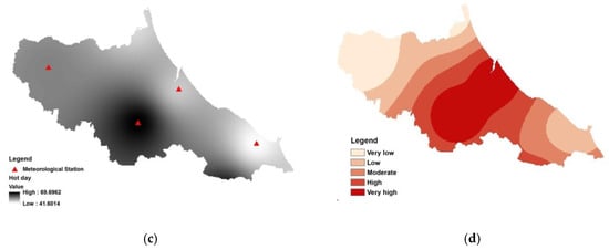 Indicators for creating an exposure component: (a) Cv of precipitation indicator; (b) Heavy rain days indicator; (c) Hot days; (d) Exposure component.