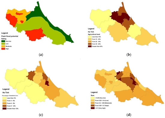 From the above three indicators, S map was created. The flash flood risk zoning map was referenced from the research work of the Ministry of Agriculture and Rural Development in Ha Tinh province []. Accordingly, the map was established based on an integrated assessment of factors affecting flash flood risks such as slope, land use/land cover, soil texture, and drainage density. The flash flood risk was classified into four levels: very low, low, moderate, and high (Figure 4a). The second indicator to assess the S component is the percentage of agricultural land. Figure 4b showed that agricultural land occupies a large proportion in the eastern part. This is a coastal plain that is favorable for growing a paddy and other crops. Districts with a large proportion of agricultural land were recorded in Duc Tho, Can Loc, Loc Ha, of which the largest proportion of agricultural land is found in Duc Tho district with 53%. In the western part, the percentage of agricultural land is less than 12% as this area is covered mainly by high mountains and natural forest. Figure 4c described visually the context of inundation levels through the percentage of inundated areas in the study area. As a result, inundated areas were mainly concentrated in the eastern part, typically Ha Tinh city over 12.7%, and Loc Ha 11.4%. The main reason was due to the storms originating from the East Sea. They often cause heavy rain and serious floods in the eastern coastal section of the study area. In the west part, the influence of the storm was weakened, so the rain also decreased slightly and caused less flooding.