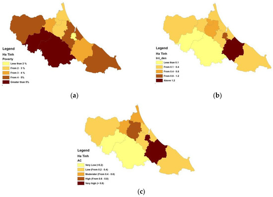 AC component was assessed based on two indicators, namely households below the poverty line and density of irrigation works. It can be said that poverty is one of the key factors in the vulnerability of households and communities to climate change, and their adaptive capacity. According to statistics of Ha Tinh Department of Labor, War Invalids and Social Affairs [], although the poverty rate in Ha Tinh has decreased rapidly from 23.1% (2010) to 3.51% (2020), Ha Tinh is still ranked as one of the provinces with the highest poverty rate in Vietnam. The research result showed that poverty rates are higher in the districts in the west than in the districts in the east. The harsh physical conditions have caused great difficulties for the socio-economic development of the districts in the west. The west is a rugged mountainous area, which is often affected by natural disasters such as flash floods and unusual colds, landslides, and Foehn wind. In addition, the west is the main living area of ethnic minorities, with low education levels. Livelihoods closely depend on natural resources. The two districts with the highest poverty rate are Huong Khe and Vu Quang with values of 5.47% and 5.38%, respectively. The lowest poverty rate was assigned Ha Tinh city with 1.32% (Figure 5a). Areas with a high percentage of poor households are less able to adapt to climate change.