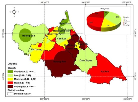 As shown in Figure 6, AV of Ha Tinh province was scaled from 0.32 to 0.67 and classified into five classes, namely very low, low, moderate, high, and very high. Within these, a very low AV level ranging from 0.32 to 0.41 was recorded. Similarly, low AV, moderate AVI, high AV, and very high AV levels were found with values from 0.41 to 0.47, from 0.47 to 0.53, from 0.53 to 0.6, and from 0.6 to 0.67, respectively. The result showed that the agriculture of Ha Tinh was facing a high risk of vulnerability due to climate change. Areas with very high AV accounted for 22% of the total area. Areas with high, medium, low, and very low AV levels accounted for 25%, 13%, 33%, and 7%, respectively.