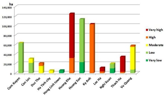 The area with the highest AV level was observed in Huong Khe (93,272.9 ha), Thach Ha (31,756.1 ha), and a part of Loc Ha district (7939.8 ha). Areas with high agricultural vulnerability levels were found in Ky Anh (103,058.7 ha), Huong Khe (31,848.2 ha), and Duc Tho (5794.3 ha) (Figure 7). These areas are frequently affected by natural disasters such as floods, storms, and tropical depressions during the rainy season. In addition, these are all poor districts. Agriculture is the main production sector and keeps a high proportion in the economic structure [], so the E index is quite high whereas the AC index of these districts is quite low. Areas with the least agricultural vulnerability were found in Hong Linh town, north of Nghi Xuan, and center of Huong Son district with an area of 5938.7 ha, 9901.5 ha, and 23,132.8 ha, respectively (Figure 7). These are areas with good irrigation systems for agriculture, so they are more active in agricultural production. Hong Linh town and Huong Son have a small area of agricultural land. Hong Linh town’s economy mainly consists of industrial and service activities, while Huong Son’s area is covered by natural forests. In addition, this is also an area with relatively stable weather conditions compared to the rest.