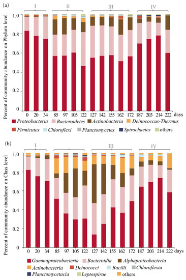 Proteobacteria and Bacteroidetes were the dominant phyla throughout the whole operation period, accounting for an average relative abundance of 55–78% and 13–35%, respectively, in different stages (Figure 3a). The changes in bacterial community composition at the class level are shown in Figure 3b. The γ-proteobacteria accounted for more than 70% of the total during stage I, decreased significantly in stage II, and then increased from 13.8% on day 127 to 73.60% on day 222 (stages III and IV). The decrease of γ-proteobacteria was accompanied by the increase of α-proteobacteria (41.14% on day 127). Figure 3c shows the results of hierarchically clustered heatmap analysis at the genus level. The top 50 genera were clustered hierarchically. Many bacteria involved in nitrogen metabolism were significantly more abundant after the PN-SBR process, including the members of the HNAD genera Acidovorax, Brevundimonas, Comamonas, Paracoccus, an unclassified genus of the family Chitinophagaceae, and an unclassified genus of the family Propionibacteriaceae. The total relative abundance of these six genera increased with the running of the PN-SBR (16.21% in stage I, 30.67% in stage II, 41.71% in stage III, and 55.47% in stage IV), much higher than that in other PN reactors for synthetic inorganic wastewater [7]. The relative abundance of Nitrosomonas, the only AOB genus detected in the PN-SBR, increased from ~0.4% in the early days to ~0.9% during stage IV, indicating that AOB was enriched to some degree. The AOB relative abundance was lower than that in similar reactors for inorganic wastewater, such as in a SHARON reactor; the relative abundance of the genus Nitrosomonas ranged from 1.0–4.4% [33], much lower than that (up to 16.1%) in a different PN reactor for synthetic inorganic wastewater [7]. The reason for the low abundance of AOB may be that their growth was inhibited by the organic compounds presented. These results indicate that there were other ammonia-oxidizing microbes, such as HNAD bacteria, in this PN-SBR, except for autotrophic AOB in regard to the high ammonia removal and transformation ability of the PN-SBR.