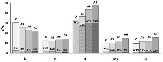 The percentage of the available nutrient contents (N, P, K, Mg, and Fe) compared with the total concentrations in composts. O—organic compost; A3, A6, A9—organic composts with a biomass ash admixture of 3, 6, and 9 wt. %, respectively.