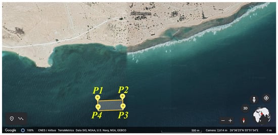 According to these discussions, and based on a previous study of Radfar et al. [], a pilot site is selected with the dimensions of 280 [m] by 130 [m] and a constant depth of 30 [m]. Figure 1 shows the location of the corners of the selected tidal site in the south of Hengam Island in Iran. The dimensions of this site are 280 [m] by 130 [m], with a constant depth of 30 [m]. The latitudes and longitudes of the corners are presented in Table 1.