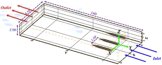 All simulations of this paper are based on DOE Reference Model 1 (DOE RM1) turbine model. The US Department of Energy (DOE), in collaboration with the National Renewable Energy Laboratory (NREL), proposed this device as an open-source design for horizontal axis hydrokinetic turbine (HAHT), and researchers can use this to benchmark their studies []. Since the nominal diameter of DOE RM1 is 20 m, the dimensions of the permitted tidal channel are 14D × 6.5D × 1.5D. It should be noted that HAHTs mechanism for extracting energy from tidal streams in much the same as the mechanism by which wind turbines extract energy from wind []. Therefore, an interesting future research direction would be applying the current methodology for wind farms. In this respect, previous studies have proven the great potential of wind energy exploitation in the southern coasts of Iran. An overview of the related literature is provided in [].