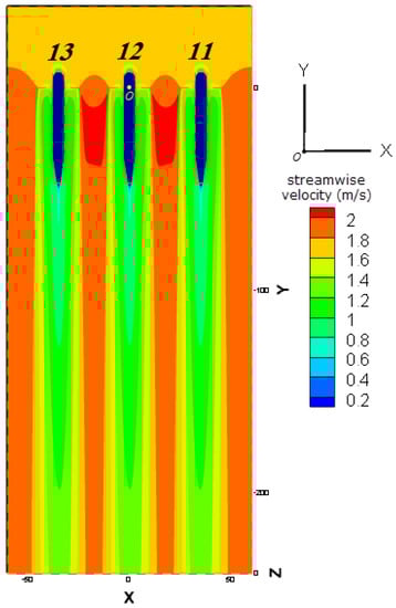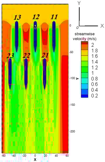 In Figure 6, seven different lines for placing the corners of downstream turbines are determined. Looking at the contours of streamwise velocity clearly shows that staggered positions (L1, L3, L5, and L7) are desirable due to higher tidal current velocity, and hence, more AKE. Three of these candidates should be selected to place the second-row turbines. According to the first simulation, rotor 13 has more power than rotor 11. Therefore, turbines of the second row are oriented to the left side of the farm. Thus, the corners of the second-row turbines should be placed on the passes L1, L3, and L5. Besides, a minimum distance of 1.5R has been applied between the ends of the nozzles of the first row with the beginning of the nozzles of the second row to avoid the disruptive effects of rotating blades. Figure 7 shows the velocity contours of this simulation. Also, the quantitative results are summarized in Table 4. Now a comparison must be made between the estimated power based on Equation (1) and the actual power based on the simulation. Results of the seventh column of Table 4 clearly show that the maximum difference does not exceed 3%.