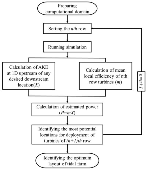 Finding an optimum location for the placement of tidal turbines in a farm causes more power output and less depreciation cost for the devices. Although there were several attempts for layout optimization of lab-scaled tidal farms, still steps are to be passed to reach a level where it is possible to implement optimization studies in full scale. However, it is known that powerful systems with several cores and huge computational costs are needed. Having these in mind, the current study is a very early step toward having an optimized full scale tidal farm. As it is mentioned previously, Mozafari [] developed a general methodology based on the results of 60 different simulations using various turbine configurations. This methodology supports the idea that there is a linear relationship between the power extracted by the turbine and the AKE flux upstream of the device. It was found that all data falls along the same slope, which is equivalent to the local efficiency of all turbines being constant, regardless of their position in the array. Owing to this fact, a new methodology has been proposed in the following section to put aside the dependence on the site specifications and generalize it for various engineering applications in different areas worldwide where potential tidal stream power is considerable. In the following, the methodology for the turbine array optimization process is presented step by step: