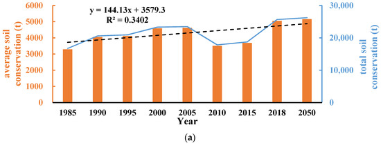 The coupling of FLUS and InVEST models was used to estimate the soil conservation services in the QLME in 2050 under the two scenarios (Figure 6). It can be found that, under the scenario of RCP4.5, the average soil conservation amount is 5243.11 t in 2050, and the total soil conservation amount is 257.876 million tons, which is increased compared with that in 2018, with a change rate of 2.18%. Under the RCP8.5 scenario, the soil conservation amount per unit area of the QLME is 5520.97 t, and the total soil conservation amount is 271.55444 million tons, with a growth rate of 7.60% compared with that in 2018.
