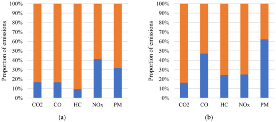 Research outside the European countries offers similar results. In China, in 2019, 56% of PM emissions from mobile sources were emitted by 40 million construction and agricultural machinery units, and 24% of PM emissions were from 340 million road vehicles [37]. In 2016, a study [38] concluded that NRMM was responsible for 1435.9 kt of CO, 345.1 kt of HC, 2426.6 kt of NOX and 188.2 kt of PM. Another study which focused on agricultural machinery concluded that this machinery was responsible for 1448.16 kt of CO, 1211.39 kt of HC, 2192.05 kt of NOX, 25.14 kt of SO2, 262.69 kt of PM10 and 249.25 kt of PM2.5 [39] (unfortunately, neither of these two studies compared the data to total emissions or emissions from road transport). Refined oil products account for 53% of China’s oil consumption, most of which is used in road vehicles and NRMM [40]. From 2015 to 2025, total emissions from construction and agricultural machinery are predicted to increase by 9% in the Beijing-Tianjin-Hebei region [41]. One study on emissions of construction machinery in Australia [42] focused on emissions from construction machinery powered by diesel engines. The emissions were higher than expected: this machinery was responsible for 50% of NOX, 24% of SO2, 76% of PM10, 99% of PM2.5, and 10% of volatile organic compounds (VOC) compared to road traffic.