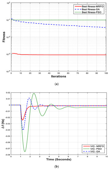 The MRFO was used to find the optimum design parameters for minimizing the system frequency deviation. In this study, the integral square error (ISE) criterion was used as the objective function to be minimized for optimum tuning of the parameters [30,39]. Therefore, the objective function of the optimization problem, depending on the ISE, can be formulated as follows: