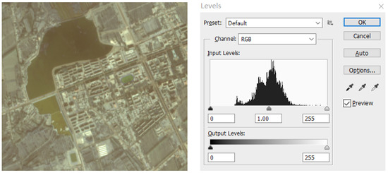 A histogram can intuitively display the distribution state of quality characteristics and can be clear about the shape, center position, and dispersion degree of data distribution. This paper adopted the synthesis of “red (R), green (G), and blue (B)”, adjusted the histogram of the image through the color scale tool, which can increase the contrast between the light and shade of the image, made it close to the natural color, and had richer layers and uniform tones. Therefore, it was more conducive to the identification and interpretation of mine information. The effect before and after stretching is shown in Figure 4.