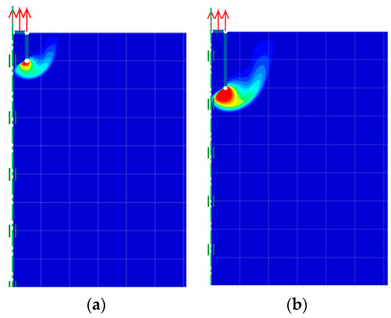 The impact of the anisotropic undrained shear strength ratio re on the uplift capacity factor N is demonstrated in Figure 11 for the cases of α = 1 and different values of m and L/D. Shown in Figure 11a–d are the cases of L/D = (0.2, 0.6, 2, 10), respectively. The convex relationship between N and re is observed for all cases of m and L/D. The value of N increases with the rise of re due to the increase of the extension of the undrained shear strength. Additionally, the rate of the increase in N is developed when the value of m is growing. The influence of re on the failure patterns is examined for the cases of re = (0.5, 0.7, 0.9, 1), as shown in Figure 12a–d, respectively. This investigation is based on the cases of α = 1, L/D = 5, and m = 5. The results show that the size of the failure pattern is bigger in both horizontal and vertical directions when the value of re is greater.