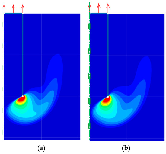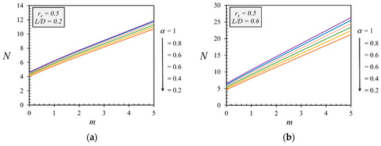 The effects of the shear strength gradient ratio m on the uplift bearing factor N for the cases re = 0.5 with different values of α and L/D are depicted in Figure 7. Shown in Figure 7a–d are cases of L/D = (0.2, 0.6, 2, 5), respectively. A linear relationship between N and m can be observed for all cases of α and L/D. An increase in m causes a linear increase in N. This is because the caissons can obtain a more mobilized resistance due to an increase in the undrained shear strength of the soil with depth. Note that a larger value of α produces a larger value of N. In addition, together with the growth of L/D, the gradient of the N and m relationship becomes greater owing to the increase of α. The comparison of four potential failure patterns (shear dissipation contour) is described in Figure 8 for various values of m = (0, 1, 2, 5). This comparison is based on the cases of re = 0.9, L/D = 5, and α = 1. The results show that the failure zone increases as m increases. This finding is compatible with the results showing an increase of N due to an increase of m.