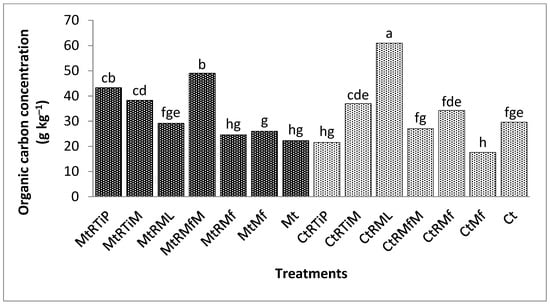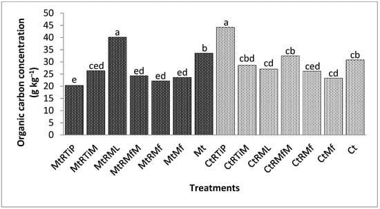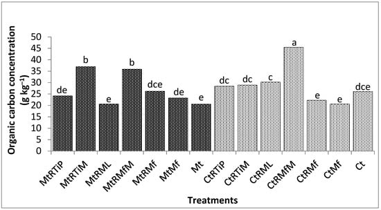 The OC concentration was significantly higher (p < 0.0001) under MtRMfM, CtRML, CtRTiM, MtRTiP, MtRML, and MtRTiM by 49, 34, 33, 28, 26, and 22% compared with the control (Figure 5).