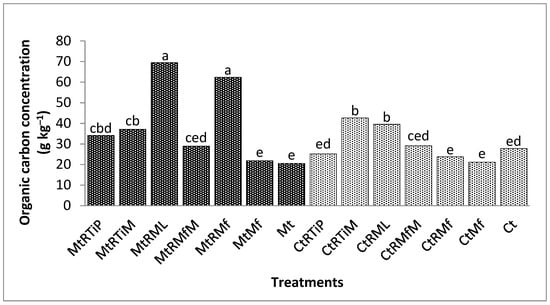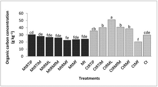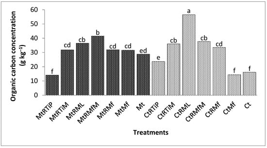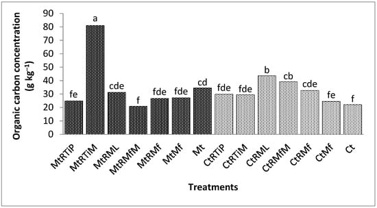 In comparison with the control, the OC concentration was significantly higher (p < 0.0001) under CtRML, MtRMf, MtRML, MtRTiM, CtRMfM, and CtRTiM by 178, 156, 74, 58, 57, and 47%. The OC concentration was not significantly different between CtMf and the control in this fraction (Figure 3).