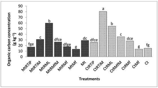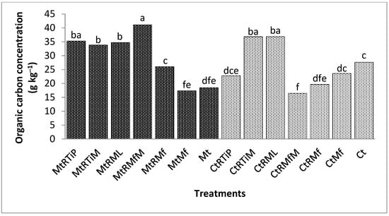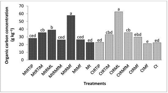 Organic carbon concentration was significantly (p < 0.0001) higher under MtRML, MtRMf, CtRTiM, CtRML, and MtRTiM by 150, 124, 54, 42, and 33% compared with the control in the 500 µm fraction (Figure 2).