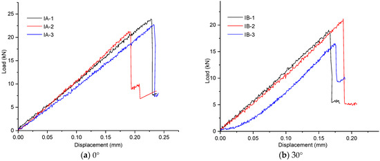 The load-displacement curves of all the oven-drying specimens are shown in Figure 6. With the gradual increase in the axial displacement, all curves generally can be divided into two stages as linear elastic and failure drop phases. The curves are a vertical line with a sharp drop after the axial load reaches the peak point, and the specimens produced a load “click” noise and lost its bearing capacity almost in a short time, which conformed to the fracture characteristics of quasi-brittle materials.