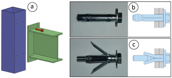 (a) Example of steel connection with blind bolts: (b) blind bolt before being tightened and (c) blind bolt after being tightened.