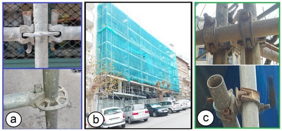 (b) Scaffolding made with quick round tube couplers, which allow for greater versatility in the building of the structures, not requiring any prior operation on the tubes and therefore being fully reconfigurable (see Figure 7b). In these types of structures, state-of-the-art reviews have been carried out, such as the one by Beale [] or Abdel-Jaber et al. [], where the properties of scaffolding connections and accessories under cyclical loads were studied. Prabhakaran et al. [] presented the analysis of scaffolds with connections containing looseness. Abdel-Jaber et al. [] showed an experimental study into the behavior of tube and fitting scaffold structures under cyclic side and vertical loads. Abdel-Jaber et al. [] researched a cyclic loading applied to sleeve couplers for tube and fitting scaffolds. The problem with these structures is that they are only valid for scaffolding or similar structures due to their configuration and the type of profile used (round tube).
