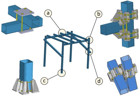 The use of clamps and bolts makes it possible to obtain a wide variety of connections between steel beams and rectangular or square section columns, leading to entirely removable and reconfigurable tubular structures. Figure 8 shows the following possible connections: (a) transverse connection between beams, (b) beam-to-column connection, (c) removable base system for square or rectangular section columns, and (d) lateral connection of beams at any angle.