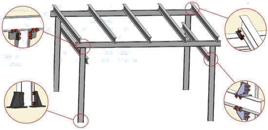 Classic bolted connections are removable but challenging to reconfigure, primarily because the beams commonly have welded end plates, usually with brackets and drills that make them impossible to reconfigure. Currently, solutions with removable brackets allow for a greater level of reconfiguration, but it is always necessary to drill the beams and columns (Figure 6). Therefore, this type of connection, while allowing for a certain degree of reconfiguration, does not allow for total reconfiguration and is more expensive than the classic bolted solution. Several research works have also been carried out on this type of connection, such as those by Reinosa et al. [], Abar et al. [], and Abar et al. [].