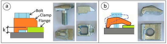 Pivoting clamps have one line of contact on one of the pieces to be joined and another line of contact on the other piece to be joined. Depending on the thicknesses of the pieces to be joined, the distance of these contact lines to the bolt varies. On the other hand, in the flat-fitting clamps, the rear part rests over its entire surface on one of the pieces to be joined, and the front part over its entire surface on the other piece to be joined. Due to the flat nature, for each thickness of the piece to be joined, a different clamp height is needed (measurement k in Figure 10a), and this height can also be achieved using an additional washer. Flat-fitting clamps can have a hole, or they can have the bolt directly incrusted.