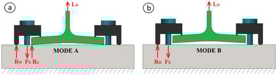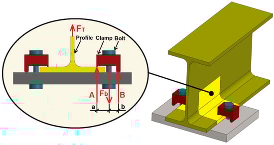 The clamps’ tightening system is based on the lever mechanism []. When the load is applied to the connection (Ft), it is transmitted to point A (Figure 11). The force produced at point A is supported by the bolt (Fb) and the reaction at the rear edge of the clamp (point B). The force at point A (assuming that the clamp is stiffer enough to transmit the forces between points A, B, and the bolt) is proportional to the value of the distances a and b (front and rear lever of the clamp), as well as the maximum force that the bolt can withstand. The equation that relates these forces is the following:
