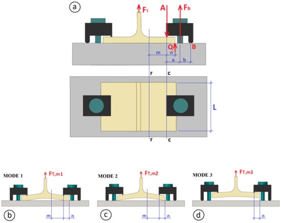Similarly, this work proposed using a T-shaped model with two clamps in the flanges and the web subjected to traction. Based on this T-shaped model, an analytical approach was proposed that allows for the calculation and analysis of the clamped connection based on the measurements of the clamp levers, the geometric characteristics of the profile, and the yield strength of the material. As in the case of bolted connections, three different failure modes can be distinguished [] (Figure 13):