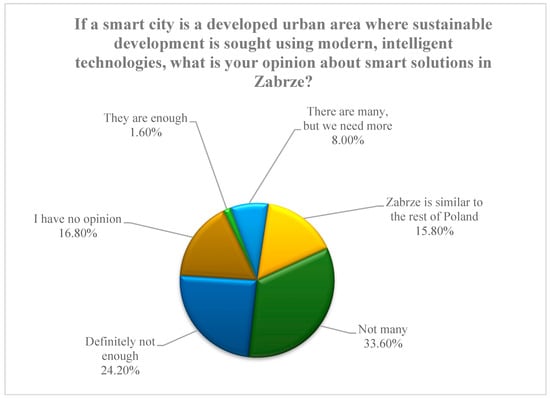 Notably, the subject of the smart city was, for the majority of respondents, an issue to which they had paid little attention. Hence, more than 80% of the residents surveyed were unable to provide an example of any solution that would make urban space smart. Only 18% of those surveyed provided the interviewers with a concrete answer to this question, indicating that education and communication activities are a challenge in the process of spreading public awareness of smart growth.