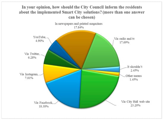 The willingness of the majority of the residents surveyed to spend funds directly dedicated to the creation of a friendly urban space on smart city activities convinces us of the validity of the need, mentioned in Section 3.1, for the local government to intensify its educational and communication activities in the dissemination, popularisation, and promotion of the smart city idea.