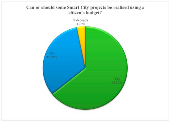 The residents’ opinions were also surveyed regarding the funding formula for smart growth implementations. One of the questions regarding participation referred to covering costs with the use of the civic budget, i.e., an amount of spending set aside within the municipal budget that is allocated for initiatives and investment projects submitted directly by the local community and most often concerning their immediate environment. Usually, such projects involve the construction of playgrounds, recreational facilities, enclosures for pets, or neighbourhood car parks. See Figure 3.The majority of Zabrze residents surveyed (over 64%) approved the possibility of allocating funds from the civic budget to pay for the implementation of smart city solutions selected and accepted by the local community. More than 32% of the respondents were against the idea. The remainder (around 3%) were prepared to conditionally accept the indicated plan but raised additional objections.