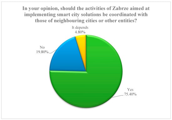Another aim of this survey was to establish the residents’ opinions on the need to consolidate local government units when implementing smart city solutions. See Figure 4. When asked whether such activities should be coordinated with decisions taken in neighbouring cities or other entities, such as the local government of the Silesian Voivodeship or the Upper Silesian Metropolitan Area, 75% of the residents responded in the affirmative. This is an expression of the social expectation that smart solutions should be implemented in a systemic, coherent, and unified way, allowing people living in different centres forming the Upper Silesian agglomeration to use them effectively. However, almost 20% of the respondents responded negatively to the need for mutual cooperation between individual local government units and the maintenance of relationships with a metropolitan association, intercommunal associations, or voivodeship government. The remainder were not convinced of the need for such cooperation but also did not question its advisability.