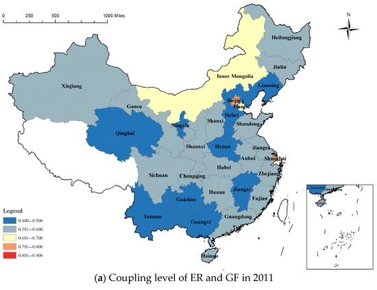 In contrast to the previous year, the overall level of the coupling coordination degree between ER and GF in the central and western provinces is relatively poor; most provinces are still in a state of reluctant coordination in the stage of excessive coordination, while Guangdong and Yunnan are on the verge of imbalance. The level of ER and GF development in the two provinces is relatively low, and there is potential for further progress in these areas. It is particularly worth pointing out that compared with 2011, Qinghai Province developed from the verge of imbalance to intermediate coordination in 2021, benefiting from the comprehensive implementation of a regional coordinated development strategy based on local conditions and giving full play to regional comparative advantages. To sum up, the spatial distribution of the coupling coordination degree between ER and GF presents an unbalanced situation between north and south and east and west.