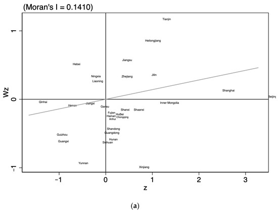 where and are the values of variables between neighboring provinces. is the data of the spatial weight matrix W. The space matrix is selected as 0-1 adjacency matrix, the neighbor rule is rook contiguity, and n is the number of regions. The value of I is [−1, 1]. If is positive, it means the space has a positive correlation; otherwise, it has a negative correlation.