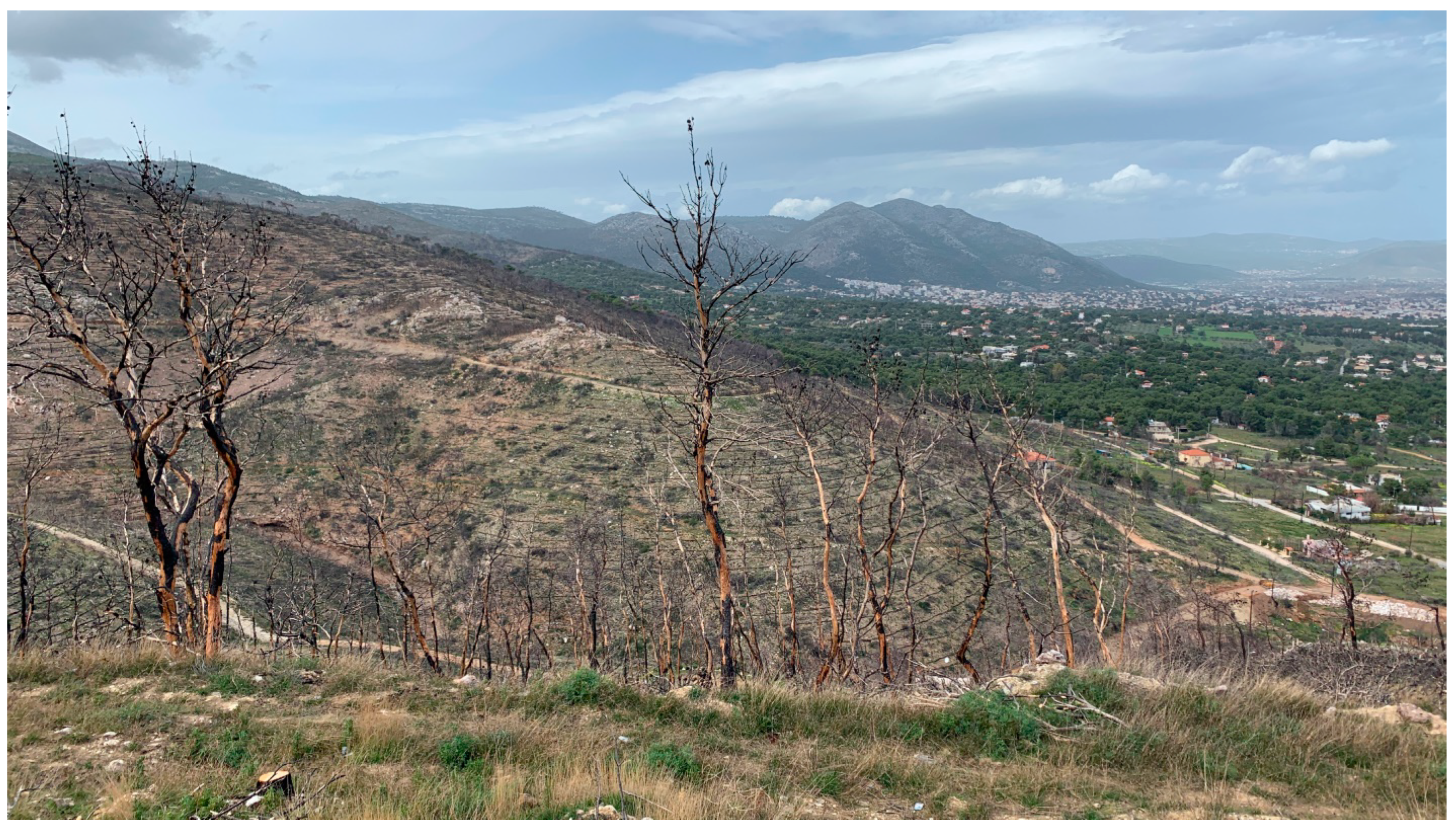 - Xanthopoulos, G.; Athanasiou, M. Attica Region, Greece July 2018: A tale of two fires and a seaside tragedy. Wildfire 2019, 28, 18–21. [Google Scholar]
