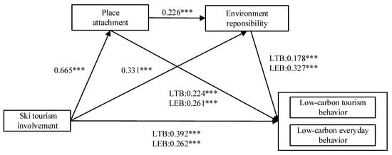 This study focused on ski tourists and constructed a theoretical model of tourism involvement, place attachment, environmental responsibility, low-carbon tourism behavior, and low-carbon everyday behavior in the context of ski tourism with the aim of revealing the drivers of ski tourists’ low-carbon behavior and the mechanisms of their behavior. Finally, 422 questionnaires were used to verify the model and proposed hypotheses, and the study had the following conclusions: